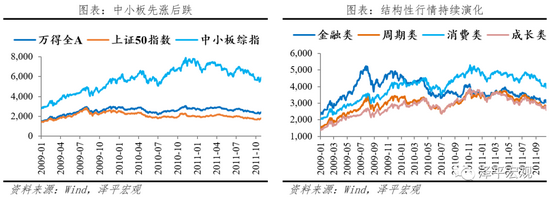 股市:呈结构性行情,中小盘表现突出。经济过热阶段(2009.7-2009.12),狭义流动性收紧时,股市存在时滞,万得全A、上证50和中小板指在货币政策转紧之时仍延续上涨态势。滞涨阶段(2010.01-2011.10),广义流动性紧缩,大盘股呈下行趋势,中小盘先涨后跌。利率敏感型的金融板块呈下降趋势,跌幅达29.5%。