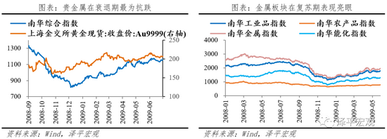 商品:金属和工业品涨幅大。经济衰退期(2008.9-2008.12),商品走势下行明显。南华金属、工业品、能化指数、农产品指数分别下跌42.4%,48.3%,49.7%,19.2%。而贵金属以其避险属性保持上扬趋势,在衰退阶段表现最佳。经济复苏期(2009.1-2009.6),由于地产、汽车和基建的拉动,工业品需求旺盛,整体表现不错。南华金属、工业品、能化、农产品指数分别上涨45.8%,40.8%,38.7%,12.4%,金属板块和工业品板块涨幅较大,能化次之。