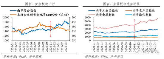 商品:滞涨阶段,商品涨幅明显。全球复苏共振,疫情反复,形成供求缺口,叠加流动性泛滥,大宗商品价格上涨。2020.5以来,商品市场整体波动上涨。过热阶段(2020.5-2020.10),金属、工业品、农产品和能化指数分别上涨2.3%,7.8%,13.2%,1.2%。滞涨阶段(2020.11-至今),商品市场涨幅更为显著。金属、工业品、农产品和能化指数分别上涨42.4%,38.6%,7.4%,32.7%,金属板块表现亮眼。
