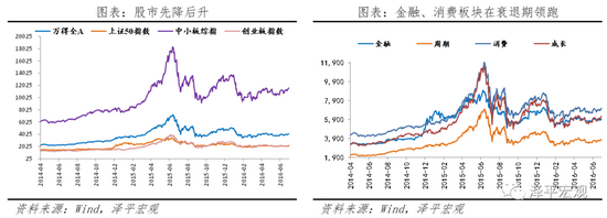 股市:大起大落。整体来看,2014年2季度起,股市进入牛市,股指连续上涨,于2015年6月12日达到最顶峰后大幅调整,从高位一路下行后持续震荡。万得全A、上证50指数和中小板综指的趋势变动基本一致。分阶段看,2014年4月-2015年3月衰退期间,股市震荡走强,金融、消费板块领跑;2015年3月-2016年7月复苏间,股市冲高回落后持续震荡,消费板块维持韧性,成长股波动相对较大。