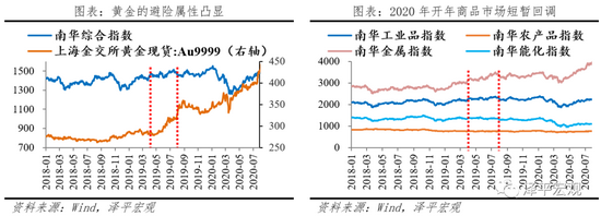 商品:商品市场短暂回调,黄金抗跌。在第一波流动性宽松时,商品市场保持震荡市行情。流动性二度宽松时,商品市场短暂回调,2020年5月重回上升通道。受益于美国经济下行和美联储持续降息的影响,黄金的吸引力提升,避险和保价属性凸显。