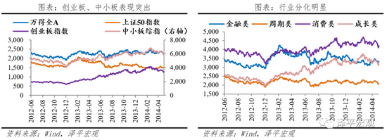 股市震荡行情,小市值、消费、成长表现突出。在流动性收紧的大背景下,风格分化,创业板和中小板表现突出,2013年1月至2014年3月,创业板指和中小板指涨幅分别达88%、26%,高市值企业在经济过热期下半场迎来一波行情,之后伴随广义流动性收紧,进入下行通道。行业表现分化明显,消费板块和成长板块在流动性周期下半场跑赢市场,涨幅分别达到20%、42%,金融板块与周期板块在经济过热期迎来小牛市,直至滞胀期来临,板块震荡下行,跌幅分别达21%、9%。