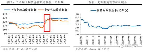 债市:狭义流动性宽松后,债市领涨。在衰退期(2008.9-2008.12),政策利率下调,债券开启牛陡行情,2008.9-2008.12,中短期、长期债券指数涨幅分别为8.7%及16.5%,拉长债券久期可以博得更高收益。在复苏期(2009.1-2009.6),实体经济回暖,收益率曲线形态整体趋于平坦,中短期、长期债券指数涨幅分别为-0.67%及-3.8%,震荡市特征明显。