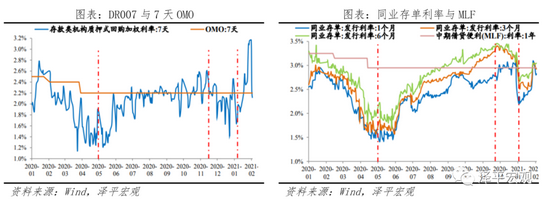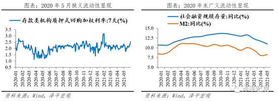 2020年5月狭义流动性率先正常化。5月央行边际收紧货币政策,DR007自低点持续上行,中枢由1.5%上行至2.2%左右,11月受永煤事件冲击,央行临时释放流动性,DR007有所下行,此后维持“稳货币”格局。值得注意的是,本轮紧货币区间,并未导致狭义流动性大幅收紧,反而保持充裕的态势,主要因为宏观审慎政策配合,约束信用扩张渠道,产生了一定程度流动性淤积。