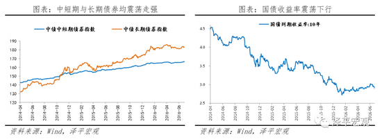 债市长牛。2014-2016年3季度,货币政策大幅宽松,债券市场经历了史上最长牛市。10年国债收益率由2014年4月的4.5%附近一路下行至2016年初的2.7%附近,中短期债券表现亦出色,中债中短期债券指数维持震荡走强态势。