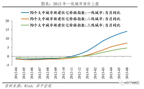 房市:一二线城市房价快速上涨。2013年,压制许久的房地产市场迎来爆发,紧信用、严调控难以阻挡房价上涨,全国70个大中城市新建住宅价格指数先后迎来正增长,一线城市房价率先上涨,房价涨幅领跑全国。面对房价涨幅压力,部分城市拿出“限购限贷、提高二手房首付”的组合拳,遏制购房的短暂需求,房价增速减缓。