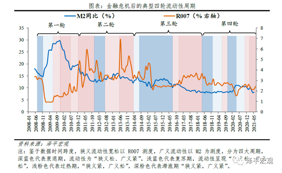 2008年以来,中国大致经历四轮典型的流动性周期,每一轮周期持续3-4年,大体按照“宽货币紧信用-宽货币宽信用—紧货币宽信用—紧货币紧信用”顺序轮转。鉴于数据可得性和时间跨度,我们选用R007测度狭义流动性松紧程度,以M2测度广义流动性松紧程度,划分四轮流动性周期。