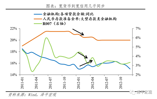 2011年末,狭义和广义流动性几乎同步宽松。自2011年末货币政策转向以来,狭义流动性宽松,R007水平在低位徘徊。保持在4.1%区间,超储率达到两年间的峰值2.3%。2012年初,“宽货币”几乎同步传导至“宽信用”。贷款余额增速由2012年初的15%提升至3季度末的16.3%,社融存量同比由2011年末的18.2%增至2012年末的19.1%,M2同比也由12.4%回升至15.9%。约4个季度后,2012年三季度GDP触底企稳。