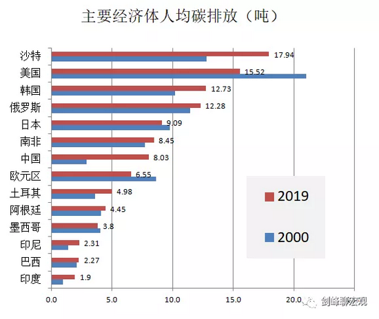 环境库兹涅茨曲线产生的原因很多,其中一个最重要的因素就是产业结构的演化。工业化早期,经济从农业向高污染的工业迁移,污染程度随经济发展不断上升;随着工业化的逐步完成,经济发展开始偏向服务业,污染程度又随经济发展不断下降。上图显示,工业化最快的中高收入国家(包括中国)恰恰是单位GDP碳排放最高的经济体。中国人均GDP超过了1万美元,已经度过了环境库兹涅茨曲线的拐点,而且,中国的产业结构早已经开始进入后工业化时代的服务业大发展阶段。一个简单的推算就可以看到,2030碳达峰的压力并不大:假设GDP以每年5%的速度增长到2030年,1元GDP将变成1.6元GDP;同时,中国单位GDP碳排放从目前的全球平均水平1.6倍下降到2030年的全球平均水平,则两者相抵,轻松地在2030年碳达峰。