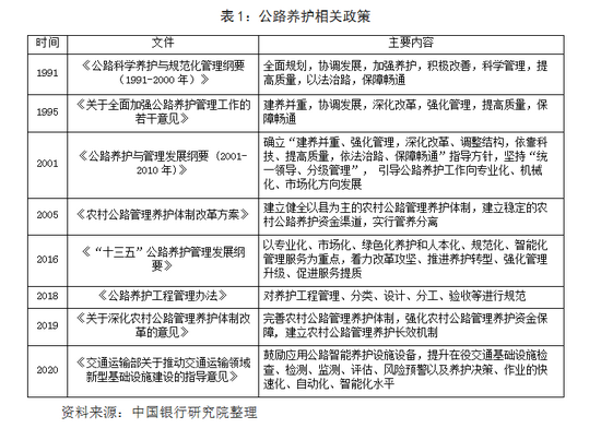 我国较早关注公路的养护管理工作,出台了一系列的相关政策。1995年交通部发布的《关于全面加强公路养护管理工作的若干意见》指出经过数十年的探索和发展已经基本形成了省、地(市)、县三级公路养护管理体制。此后公路养护管理体制不断完善,养护技术不断进步。一是养护管理理念逐步向专业化、绿色化、智能化发展,养护新技术、新材料、新工艺、新设备不断涌现,相关技术规范和技术标准不断完善,国家公路网综合养护管理系统初步搭建。二是高度重视农村公路管理养护体制的完善。出台针对农村公路养护管理的相关政策,各地基本建立“以县为主、分级负责、群众参与、保障畅通”的农村公路管理养护体制,2018年县、乡农村公路管养机构设置率达到99.9%、92.9%。