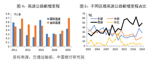 与农村公路相比,近年来国道、省道新增里程较低。随着我国高速公路网络逐步完善,国家高速公路建设速度将有所放缓。根据《国家综合立体交通网规划纲要》,到2035年国家高速公路网将达到16万公里左右,这意味着年均要增加里程约3100公里,这要低于2010-2020年的年均5500公里。同时新增里程除了新建还将通过省级高速公路升级改造等方式扩充。从不同区域看,近些年高速公路新增主要在西部地区。未来东部地区新增里程将有所放缓,中西部地区高速公路建设仍有空间。