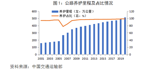 我国公路里程位居世界前列,公路里程从改革开放初期的89万公里上升到2020年的519.8万公里,其中高速公路里程位列世界首位,2020年为16.1万公里。随着我国基础设施存量规模的增大,未来相关的维修养护需求将大量增加,养护将面临更大的资金压力。