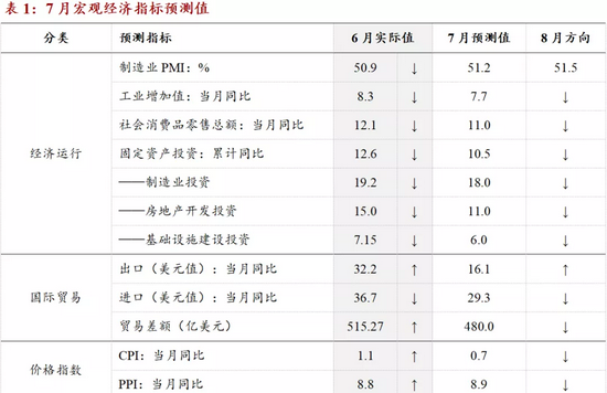 我们对经济运行、商品价格、货币金融、国际资本流动等方面指标的7月走势及下一阶段大类资产配置方向预测如下: