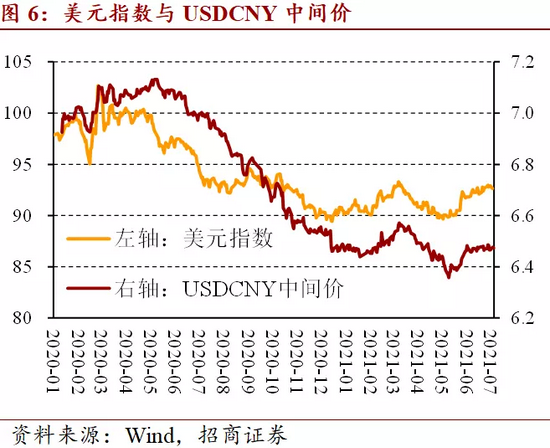 预计7月股票市场外资流入维持低位,债券市场外资流入有所下降。7月Delta变种引发的疫情新一轮发酵两度引发包括欧美股市、商品在内的风险资产调整,VIX指数抬升也反映风险情绪恶化,预计我国股市资金流入维持低位。7月美债收益率维持低位,中美利差从上月的158BP反弹6BP至164BP,美元有所反弹,不过广义美元指数同比仍然下行,对外资增持利率债仍构成支撑,但上月的人民币贬值或使得外资增持同业存单动力下降,预计我国债券市场的外资流入有所下降。预计7月债市、股市的外资流入规模分别为400亿元、200亿元。