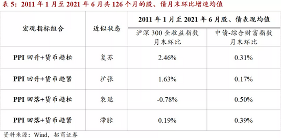 回顾2011年1月至2021年6月共126个月的股、债月末环比增速均值(表5):可以发现在PPI回升+货币趋松(M2、社融增速、利率工作等)的宏观场景中,权益市场表现最好,债券市场次高,这基本是2020年5月至11月对应的情况;在PPI回升+货币趋紧的宏观场景中,权益市场表现次高,债券市场最低,这基本是2020年12月至2021年5月对应的情况。