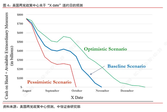 从历史上来看,两党博弈最终都会尽可能避免政府违约情形的出现,所以预计达成协议最晚的时间应该不会晚于“政府违约日”。按照美国两党政策中心的预测,“X date”(政府违约日)最早可能出现在10月初,中性预测也在11月之前,因此美国两党在此之前达成协议的概率最高。