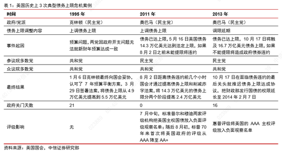 其他年份虽然没有出现过实质性违约事件,但是由于针对提高债务上限的谈判掺杂了党派各方的执政利益而变得曲折和不确定,给市场带来了较大的波动。其中比较典型的案例包括1995年、2011年、2013年发生的三次比较严重的债务上限危机(政府技术性违约)。债务上限危机的发生往往伴随着党派之间政治利益的角逐,最终结果一般是互相妥协——提高债务上限或者暂时取消上限,其影响包括政府关门、评级下调、债务违约等。