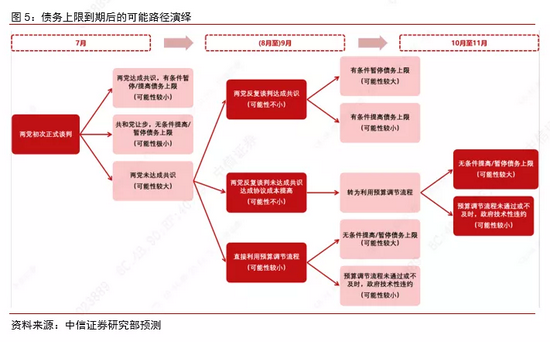 ▌ 展望:预计10月左右达成债务上限协议。从历史上来看,两党博弈最终都会尽可能避免政府违约情形的出现。按照美国两党政策中心的预测,“X date”(政府违约日)最早可能出现在10月初,中性预测也在11月之前,因此美国两党在此之前达成协议的概率最高。理论上达成协议的方式有两种:一是两党达成一致,在参议院获得60票通过。由于民主党很难获得共和党额外的10票,这一情形的概率相对偏低;二是民主党通过“预算调节”的方式通过,仅需民主党内部51票即可,但大概率要与新财年的财政计划绑定,预计最早也是在9月底-10月初通过。