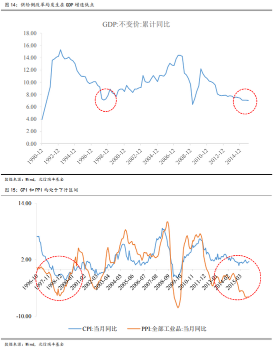 对比1998年左右与2016年的供给侧改革,在时点选择上,1998年与2016年同时对应着GDP增速下行时期,1999年四季度增速为7.66%,2015年四季度增速为7.04%。CPI与PPI均呈下行趋势,价格下跌,工业通缩,且两个时期PPI表现都更为低迷。此外,部分产业产能利用率低下,产能过剩严重,企业盈利向下,1998年主要是纺织业,2016年主要是煤炭钢铁等传统行业。在货币政策方面,这两个时期央行均通过降息降准来刺激经济回升。
