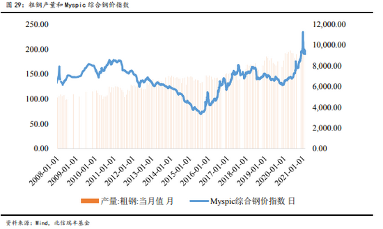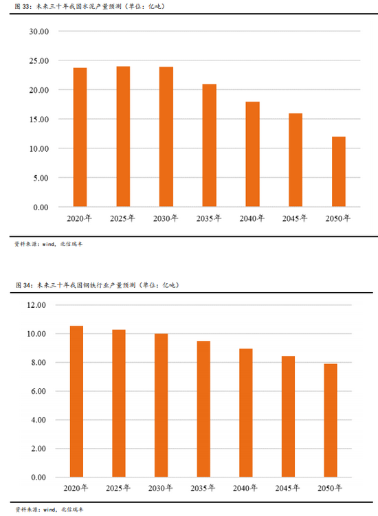 终端部门碳排放主要来自工业、建筑、交通三个领域,其中节能重点是提升终端电气化率水平,减少化石能源消费。据中国能源研究会预测,到2060年我国终端部门电气化率将由现在的27%提升至64%。而减排重点就是直接降低产量而非产能,上一轮供给侧改革中,以差别化电价、阶梯电价为代表的市场化政策,以及清查中频炉(地条钢)和确认落实产能置换的行政手段,有效促进了钢铁行业落后产能淘汰,但实际上粗钢产量在供给侧改革的进程中是保持回升的,粗钢产量连创新高,容易再一次引发供需失衡。