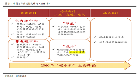 在含碳能源燃烧使用的能源活动碳排放方面,我国不同行业及生产部门的差异十分巨大。2018年发电及热力行业能源活动碳排放占总量的51%,工业部门能源活动碳排放占28%,交通运输业能源活动碳排放占10%,建筑业占4%。我们认为,实现2060年碳中和的全产业链碳减排路线,可以概括为能源部门、终端部门、环保部门三个维度:
