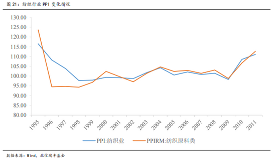 纺织行业的去产能真正成功,盈利真正实现趋势性的改善是在两段典型的需求拉动时期,2002年到2003年,中国加入WTO之后,外需增长,同时国内迎来房地产黄金十年,投资增速也不断抬升;2009年到2010年,政府为应对金融危机而进行了“四万亿”强力刺激。在需求的支撑下,上游利润得到了同步抬升,纺织业价格在2002年触底后走入上行区间。