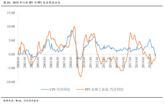 供给侧改革引发短期的结构性通胀,但并未引发全面性高通胀。在2015年之前CPI和PPI同比基本保持着高度正相关的走势;而在2015年之后,CPI同比与PPI同比之间的走势分化成为一种常态。我国供给侧结构性改革在15年底正式提出,也就是说,CPI和PPI同比的分化走势,正反映出宏观调控的重点从需求侧向供给侧的转移过程。