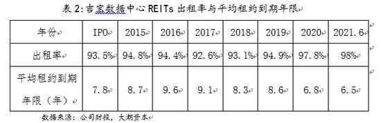 截至2021年半年报公布的数据,吉宝数据中心REITs目前整体出租率为98%,平均租约到期年限为6.5年。可以看出吉宝数据中心有较强的运营能力,整体出租率长期稳定在较高水平。而近期的收购公告中也指出,在收购完成后,整体出租率会由目前的98%提高到98.2%,平均租约到期年限也会由6.5年提高到7.3年,将进一步优化REIT的收益能力。