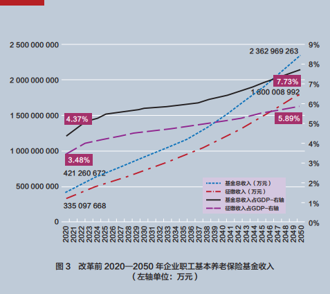 从收入的角度看,延退前后有一定的改变。在目前退休政策不变条件下,2020年基金总收入(含缴费、财政补助和利息)为4.21万亿元,占GDP的3.48%,到2050年总收入将达23.6万亿元,GDP占比将达7.73%。但如果2022年开始实施延退计划,2050年我国企业职工基本养老保险收入将提高到24.8万亿元,GDP占比提高到8.1%。