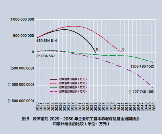 经过对实施延迟退休政策前后的比较发现,从总体缺口规模来看,改革后的总体缺口明显缩小。改革前2035年基金枯竭后至2050年各年当期收支缺口简单加总后高达93.7万亿元,在抵消2035年底留下的累计结余1.66万亿元后,实际缺口为86.8万亿元。而改革后2042年基金枯竭之时到2050年各年当期收支缺口简单加总后仅为15.97万亿元,与2042年留下的4160.6亿元基金累计结存相抵之后,缺口当期值总计仅为15.6万亿元。就是说,如果不实施延退改革,未来的养老金赤字将高达86.8万亿元,如果2020年实施延退改革,养老金赤字仅为15.6万亿元(见图7、图8)。
