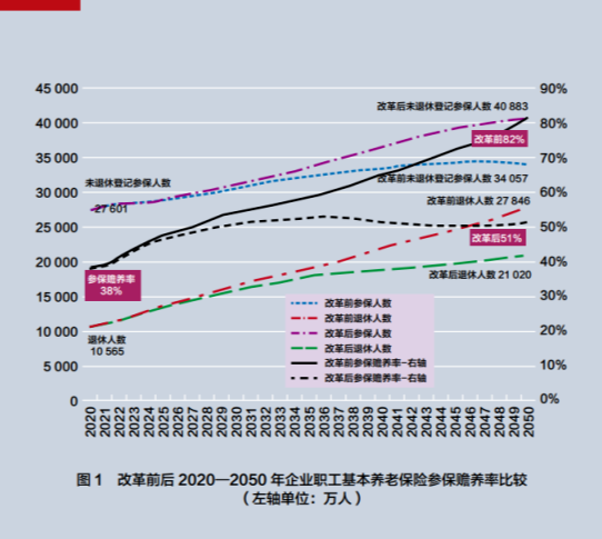 在不实施延迟退休政策下(下称“不改革情况下”),未退休登记参保人数将从2020年的2.76亿人逐渐提高到2050年的3.41亿人,30年里仅增加0.24倍,而退休人数则从1.06亿人激增至2.78亿人,未来30年将增加1.64倍,最终将导致参保赡养率从2020年的38.3%提高到2050年的81.8%。但在实施延退改革之后,参保赡养率将得到极大缓解:未退休登记参保人数到2050年将提高到4.09亿人,而退休人数则降至2.10亿人,这一增一降使2050年参保赡养率降至51.4%。