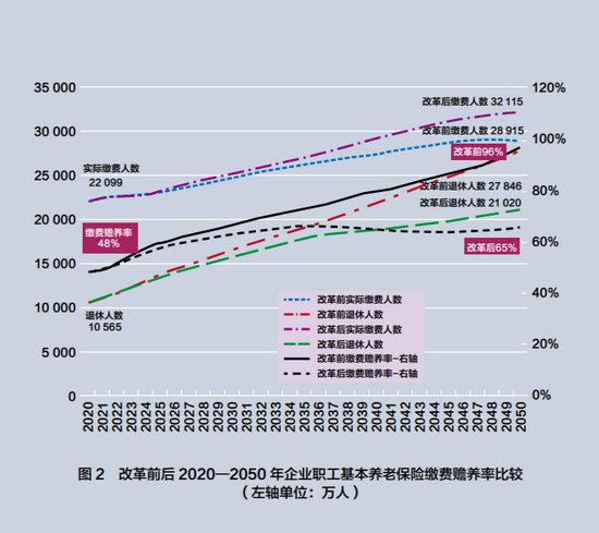 那么延退政策对缴费赡养率有什么影响呢?如不实施延退改革,2020年实际缴费人数是2.21亿人,到2050年将提高到2.89亿人,退休人数没有变化,还是从1.06亿人提高到2.78亿人,于是缴费赡养率明显高于登记参保赡养率——2020年是47.8%,到2050年将提高到96.3%。实施改革之后,情况有明显改变——2050年实际缴费人数将提高到3.21亿人,退休人数是2.10亿,于是缴费赡养率则从改革前的96.3%降至65.5%,大约下降30多个百分点。