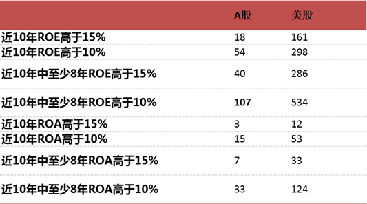 统计发现,美股近10年ROE稳定高于15%的公司有161家,近10年ROA稳定高于10%的公司有53家。而在A股市场中,近10年ROE稳定高于15%的公司仅18家,约为美股数量的10%。