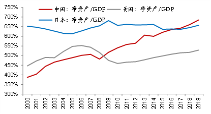 用一国的净资产除以GDP,比较中、日、美的财富效率,同样发现中国的财富效率是最低的。