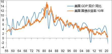 而中国的十年期国债收益率波动幅度极小,长期维持在3%左右,且远低于名义GDP增速(2020年为特例,2021年以后彼此的“缺口”又会恢复)。