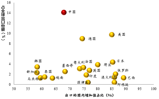 例如自动数据处理设备、无线电话机配件、计算机和电子产品的整体附加值比重只有45%,远低于其他国家,尤其是美国、日本等发达国家的附加值占比都超过80%。从国际分工的角度看,中国的分工主要是附加值相对较低的制造、加工和装配。
