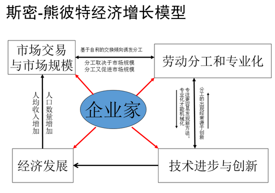 经济学创始人亚当·斯密怎么理解经济增长?他的著作《国富论》,英文全名直译过来就是《国民财富的性质和原因研究》,研究的是一个国家怎么变得富有。很可惜,他的增长理论被经济学家慢慢遗忘了。斯密增长理论的核心是市场规模和劳动分工。斯密认为:一个国家的经济增长、财富增长,主要来自劳动生产率的提高;劳动生产率的提高靠技术进步,也就是现在讲的创新;技术进步和创新取决于劳动分工和专业化;而劳动分工和专业化取决于市场规模的大小。市场规模越大,分工越细,专业化越深,创新就越多,劳动生产率越高,经济增长越快;经济增长以后,人们的收入提高了,市场规模进一步扩大,就形成了一个正向循环。这个正向循环里,市场规模有着举足轻重的作用,对我们理解贸易和全球化对经济增长的贡献非常重要。静态看,市场规模不仅取决于人口数量,也取决于人均收入水平;动态看,市场规模决定人均收入水平。开放可以扩大市场规模,所以对经济增长尤为重要。按照斯密的增长理论,经济增长在本质上并不是一般经济学家告诉大家的GDP提高3%、5%或8%,而是新产品、新技术、新产业的不断出现。也就是说,总量增长和结构变化是不可分开的,没有结构变化就不可能有总量增长。这确实是过去200多年里发生的事情。传统社会里只有农业、冶金、陶瓷、手工艺等几个行业,产品很简单,其中农业占主导地位,其他几乎可以忽略不计。现在人类有多少个行业?按照国际的多层分类标准,仅出口产品,两位数编码的行业有97个,4位数编码的行业有1222个,6位数编码的行业有5053个,而且还在不断增加。按照现在超市产品种类的统计口径:200多年前人类生产的产品总数量只有102到103,现在则达到108-1010,也就是1亿种至100亿种。截止2021年3月21日,亚马逊网站出售的产品就有75,138,297;如果把亚马逊的电商包括进去,销售的产品总数达到3.5亿种。但亚当·斯密没有讲经济增长正循环的核心驱动力是什么。市场是如何出现的?分工究竟是怎么形成的?创新又从何而来?这些问题在斯密看来有点像是自发产生的。100多年前,奥地利经济学家熊彼特(Joseph Alois Schumpeter)在《经济发展理论》一书中,提出了“创新”和“企业家精神”这两个概念。在熊彼特看来,经济增长=创新=企业家精神。企业家做的就是“创造性破坏”(creativedestruction),不断创造出新产品、新技术、新市场、新的原材料和新的组织方式。这个理论非常深刻,我觉得可以永垂不朽,但很可惜他的理论至今没有进入主流经济学,我觉得这是经济学家的愚蠢。人类就是这样,一旦拥有一个框架,喜欢不停地再往里面放东西。如果再出现别的框架,全新的、颠覆性的理论,大家就很排斥,所有不符合原有框架的,都拒之门外。我本人很幸运,在1984年就写了第一篇关于企业家的文章,1989年又出版了第一本关于企业家精神的书,研究企业家在中国相对较早。过去几年,我努力做的一件事,就是将斯密的增长理论和熊彼特的企业家理论结合在一起,概括出“斯密-熊彼特增长模型”,如下图所示。