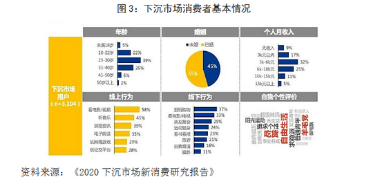 第二,小镇青年是下沉市场消费主要力量。《2020下沉市场新消费研究报告》调查结果显示,下沉市场消费者平均年龄为28.7岁,已婚人士占比较大,个人月收入主要集中在6000元以下,偏好视频娱乐,自由个性突出(图3)。这反映出,当前下沉市场网购消费主要由个性鲜明的90后引领,消费主力主要是当地收入较高的青年群体,俗称“小镇青年”。具体来看,根据下沉市场消费者的网上购物、娱乐习惯,可将其分为几个典型类型,各类消费者都有明显的偏好和特征。例如,空闲娱乐类(网上娱乐时间长,网购频率高)、囤货爱好者(打折季进行家居用品等大量囤货)、超级羊毛党(对价格十分敏感,关注比价、促销、性价比)、社交消费达人(积极参与拼团、好友助力等促销活动)、品质追求者(偏爱高质量商品)。由此可见,下沉市场消费者的需求十分多样,既有对价格的追求,也有对产品品质的追求,还有对社交和娱乐的追求。