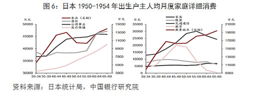 第一,老年人边际消费倾向下降可能并没有想象的严重。根据第七次全国人口普查数据,2020年中国65岁以上人口占比达13.5%,较2010年上升5个百分点,接近中度老龄化水平。从经济的角度看,个人对物质的消费在出生后逐步增加,在中年达到顶峰,并在进入老年后逐步减少(图4)。但是从国际经验来看,若老年人口较为富裕,进入老龄化社会并不直接意味着消费下降。近年来,在日本整体消费下滑的同时,老年人的消费占比不断提升。2019年,日本60岁以上家庭消费占比达到46.9%,比2000年提升17个百分点,而同期日本60岁以上人口占比仅提升11个百分点(图5)。在具体消费领域方面,进入老年后,各个细分领域的消费将有升有降,其中,医疗保健、食品、居住等消费上升,教育、交通通信等消费下降(图6)。