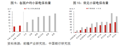 第二,老龄化不利于家具家电消费,但户均人口下降和消费升级背景下,小家电等消费仍有增长机会。从各国经验上来看,老龄化程度加深将对家具、家电消费带来负面影响。但相关消费在老龄化趋势下并非没有机遇。第七次人口普查中,我国户均人口数由2010年的3.1人下降至2020年的2.62人,家庭规模小型化趋势明显。家庭规模小型化将在一定程度上有利于小家电等消费。同时,家庭对于家电产品的功能需要随着生活水平的提高而变得更加多样化,这也将增加对功能各异小家电的需求。当前,中国一二线城市的小家电户均拥有量不足10件,这与日本(17件/户)、欧美(20件/户以上)等发达国家相比,还有很大增长空间(图9)。常见的扫地机器人、电动牙刷、加湿器、吸尘器等升级类小家电户均保有量也与日本等发达国家差距较大(图10)。
