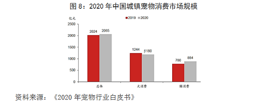 根据第一财经商业数据中心(CBNData)联合天猫宠物发布的《2020宠物医疗消费洞察》,年轻一代的宠物医疗消费贡献度较高。此外,淘宝天猫数据也显示18-25岁的消费者为线上购买宠物零食最多的人群。《2020年宠物行业白皮书》公布的数据显示,2020年全国城镇宠物猫和宠物狗的数量达10084万只,同比增长1.7%;2020年我国城镇宠物(猫狗)消费市场规模达2065亿元,同比增长2%,近十年复合年均增长率高达28.9%。目前中国家庭的养宠比例在12%左右,对比美国、日本60%、30%的宠物拥有率,中国的宠物家庭渗透率提升空间十分广阔。
