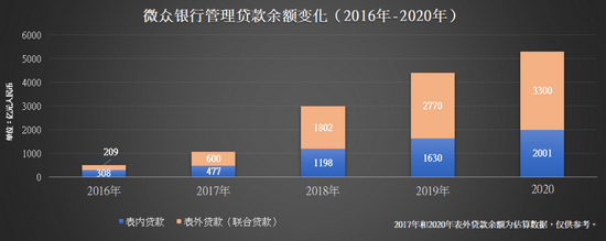 通过联合放贷模式,微众银行将信贷资产大量出表。截至2018年末和2019年末,微众银行表内贷款余额分别为1198亿元和1630亿元,表外贷款余额(银行等持牌机构名下)分别为1802亿元和2770亿元。2020年,微众银行表内贷款余额为2001亿元;表外贷款余额按20%的保守增速计算,有望达到3300亿元。