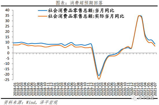5、消费超预期回落,商品和服务消费均出现回落。7月社会消费品零售总额两年复合平均增3.6%,较上月下滑1.3个百分点。其中商品和餐饮消费两年复合增速分别为3.9%和0.9%。商品中建筑装潢为主要拖累项,或与地产销售下行有关。疫情对服务消费的影响短期较难改善,叠加近期局部疫情再次爆发,餐饮消费继续出现回落。