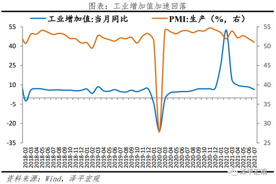 1、生产端加速下滑,与需求放缓、限产、用电荒、经济复苏不均衡、下游企业经营压力有关。7月工业增加值两年平均复合增速5.6%,较上月大幅回落0.9个百分点,连续三个月下滑,与PMI生产分项变化相印证。其中,出口对生产带动作用较上月减有所弱,出口交货值同比增速11.0%,较上月下滑2.4个百分点。