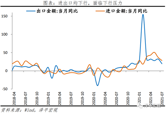 7月中国出口额(以美元计,下同)同比增19.3%,两年复合增长12.9%,低于上月2.2个百分点;环比0.4%,较上月下滑6.3个百分点。短期,原材料成本上升、海运运费高涨、集装箱“一箱难求”,压制出口商成本和出货速度。长期,受制于经济修复的重心转移到服务、外需下滑;新兴经济体不断恢复,产能替代消退。
