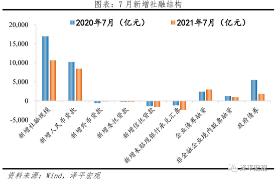 结构层面,政府债券、表内外融资共同拖累,企业发债修复。7月新增人民币贷款8391亿元,同比少增1830亿元,票据融资放量支撑,信贷结构不佳;企业债券融资2959亿元,同比增加601亿元,环比减少611亿元;表外融资减少4038亿元,同比多减1389亿元。其中,未贴现票据减少2316亿元,同比多减1186亿元。信托贷款减少1571亿,同比多减204亿元。委托贷款减少151亿元,同比基本持平;政府债券融资1820亿元,同比大幅多减3639亿元。