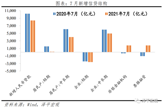 7月金融机构口径信贷同比增速为12.3%,与上月持平。7月金融机构口径新增人民币贷款1.08万亿元,同比多增905亿元;新增企业贷款4334亿元,同比多增1689亿元。短期贷款、中长期贷款、票据融资同比分别少增156亿元、少增1031亿元、多增2792亿元;新增居民贷款4059亿元,同比少增3519亿元。其中,短期贷款新增85亿元,同比少增1425亿元。中长期贷款新增3974亿元,同比少增2093亿元,主因地产调控加码,打击“学区房”炒作、“假离婚”购房等政策发酵。