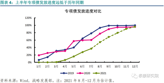 上半年进度偏慢主要三点原因:1)提前批额度下达偏晚。2019年、2020年提前批额度分别于2018年12月、2019年11月下达,以便次年一月即可启动发债。但今年提前批额度3月初才下达,导致1-2月份没有新增专项债发行。2)项目审核趋严。如前所述,针对2020年专项债发行中抢资金、前期论证不充分、项目“掺水”、资金利用不充分等问题,财政部要求地方财政部门加强对专项债项目的审核工作,因此,虽然发债节奏有所放缓,但在严监管下资金落地形成实物工作量的效率有望提升。3)稳增长压力较小。新发专项债规模不及预期的根源是经济稳步恢复,完成全年增长目标压力不大,地方政府发债意愿和实际建设需求不足,地方缺乏优质项目储备。