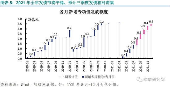 下半年发债有望延续至四季度,但大概率无法达成全年限额。假设全年专项债额度基本达成。1-6月累计发行1.01万亿,剩余额度2.64万亿,7月实际发行0.34万亿。从往年经验看,下半年新增专项债主要集中在三季度完成发放,这是由于近几年财政部都会通过发文明确规定当年新增额度的使用截至时点,如2019年规定9月底前完成全年额度;2020年争取10月底前发行完毕,预留11-12月以形成实物投资。今年政府文件和会议中尚无对截至时点的明确要求,结合“科学设计发行计划”、“适度均衡发债节奏”的政策导向,发行截止时点大概率延长至第四季度。从维持宏观杠杆率基本稳定的角度看。3月15日国常会提出的“保持宏观杠杆率基本稳定,政府杠杆率要有所降低”。根据平安证券测算,假定2021年政府杠杆率持平于2020年的45.6%、名义GDP同比增长12%,则今年可新增专项债约2万亿,远低于全年限额。因此,考虑政府杠杆率要求,今年新增专项债额度在年内无法用完的可能性大大提升。