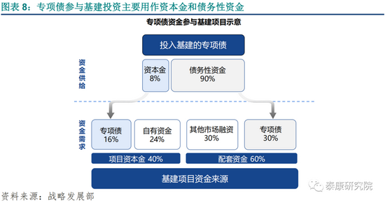 基建项目中,专项债作为资本金占比项目总投资额约为16%,作为债务性资金占比约为30%。企业预警通专项债专题数据显示,2020年专项债在基建类项目资本金中的比例约为40%,占项目总投资额的16%,另有24%的项目资本金来自企事业单位自有资金等其他资金来源,合计占比40%。在60%的配套资金中,姑且按照作为债务性资金的专项债与其他市场融资各占30%进行推算。需要注意的是,上述基建项目资金结构仅为一般统计意义上的比例,存在特定项目兼具两种性质的专项债,只有其中一类,或都没有的情况,但对后续主要结论影响不大。